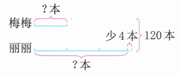 **例题3** 丽丽和梅梅共有120本书,丽丽的本数比梅梅本数的3倍少4。丽丽和梅梅各有多少本书?