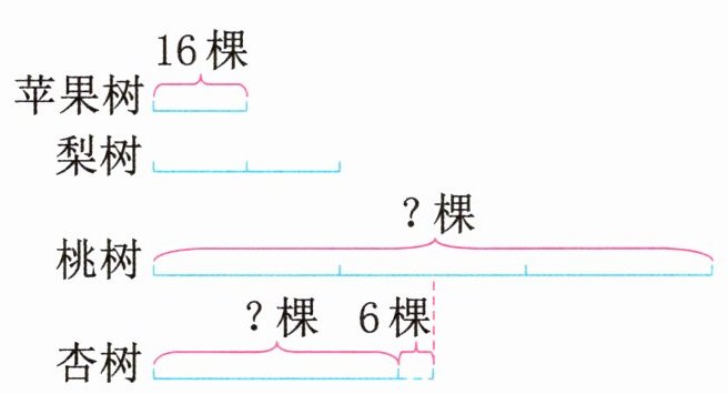 例题2 果园里有桃树、梨树、杏树和苹果树。苹果树有16棵,梨树的棵数是苹果树的2倍,桃树的棵数是梨树的3倍。