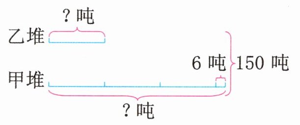 由上图可知,从150吨里去掉多的6吨,剩下的质量一共有4份,所以剩下的质量除以4就是乙堆沙子的质量,再用总质量减去乙堆沙子的质量就能得到甲堆沙子的质量。