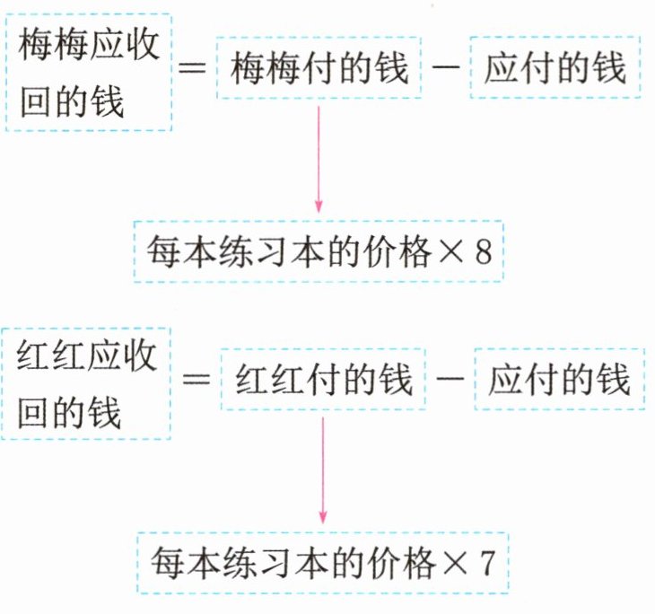**例题6** 3人去文具店买同样的练习本。到店后,丽丽发现没带钱,于是梅梅买了8本,红红买了7本。回来后三人决定平分这些练习本,且平均承担买练习本的费用。这样丽丽需要拿出20元,梅梅和红红分别需要收回多少元?