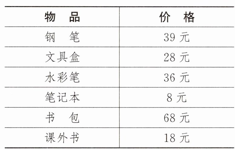 例题1 毛毛带100元去商店购买物品。一些物品的价格如下表: