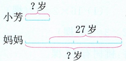 从上图可以看出,小芳比妈妈小的27岁正好是小芳今年年龄的3倍,用27除以3得到小芳今年的年龄,再根据妈妈今年的岁数正好是小芳的4倍,求出妈妈今年的年龄。