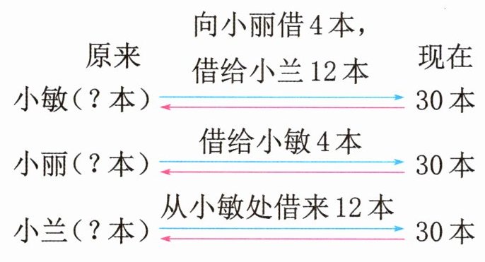 思路导引:要求三人原来各有多少本,就要从三人现在拥有的图书开始思考。现在三人一共有90本,且三人的本数一样多,所以每人有90÷3 = 30(本)。根据“如果小敏向小丽借4本,再借给小兰12本,那么三人拥有的图书就一样多”,可以进行倒推,如下图:
