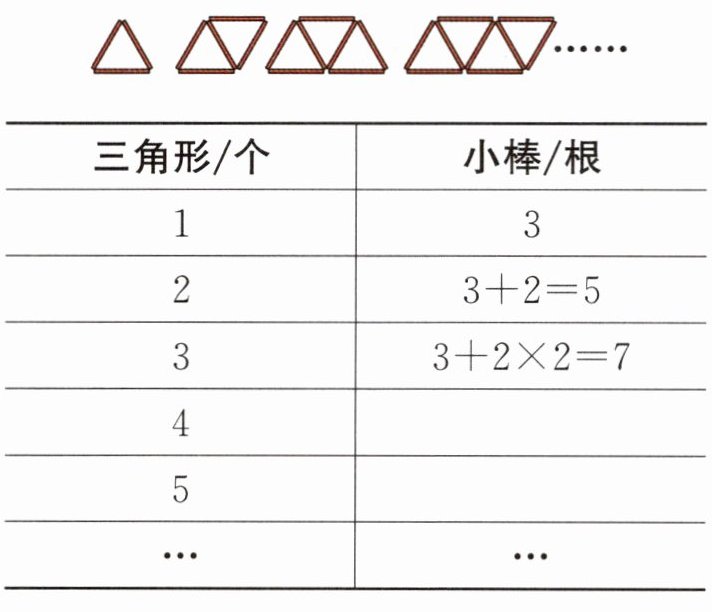 7. (探究题)如图,小红用1分米长的小棒摆1个三角形、2个三角形、3个三角形……摆这些图形分别用了多少根小棒?将表格填写完整。