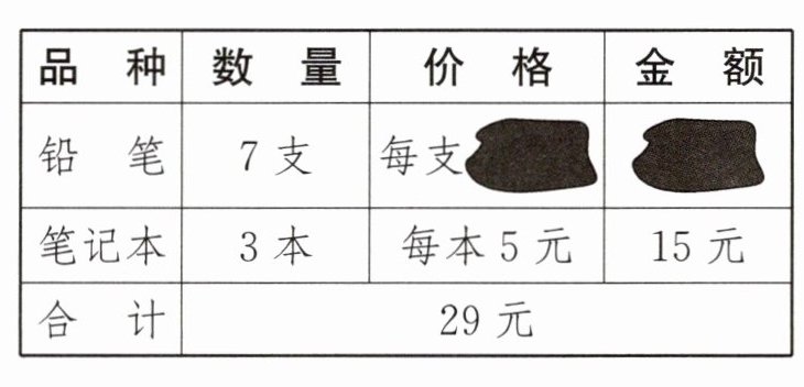 3. (难点题)张阿姨去文具店买文具,不小心把买文具的发票弄脏了,请你帮她算一算每支铅笔是多少元。