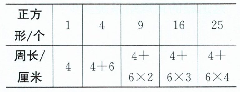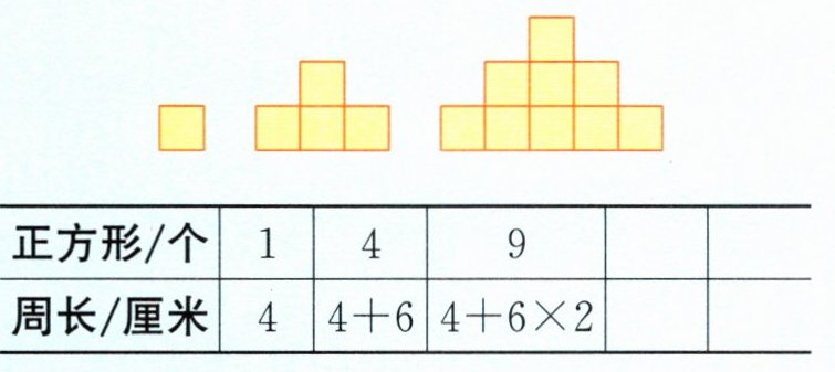 思路导引:正方形有4条边,每条边长是1厘米。由题图可知,第1个图形是1个正方形,有4条边,周长是4厘米;第2个图形是由1 + 3 = 4(个)正方形组成的,有4 + 6 = 10(条)边,周长是10厘米;第3个图形是由1 + 3 + 5 = 9(个)正方形组成的,有4 + 6×2 = 16(条)边,周长是16厘米。发现后一个图形都是在前一个图形的下面再增加一层,增加的这一层比原来最下面一层多2个正方形,所以周长增加的部分可看作是这2个正方形中的6条边,即增加6厘米。