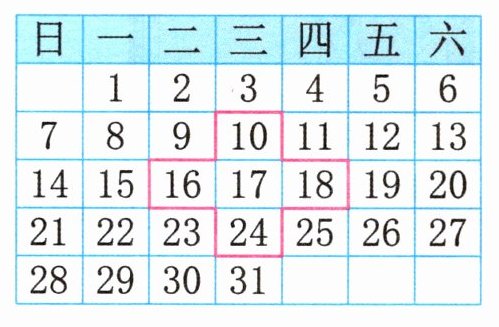 (1)10 + 16 + 17 + 18 + 24 = 85 框出的五个数的和是中间数17的5倍 (2)45÷5 = 9 框出的五个数分别是2、8、9、10、16
