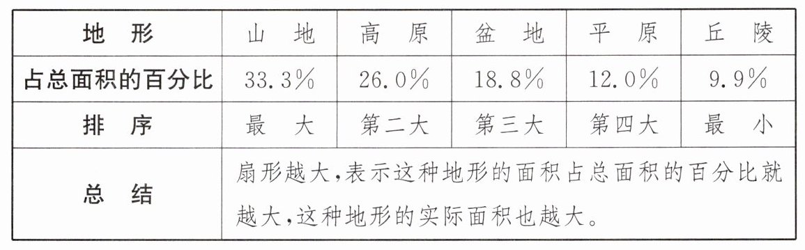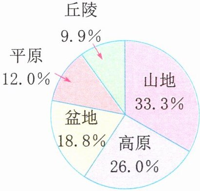 (2)这个圆被分成五个扇形,圆内各个扇形的大小表示各种地形的面积占总面积的百分之几。