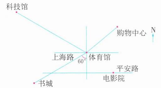 (2) 购物中心在体育馆的( )偏( )( )°方向( )米处。(4分)