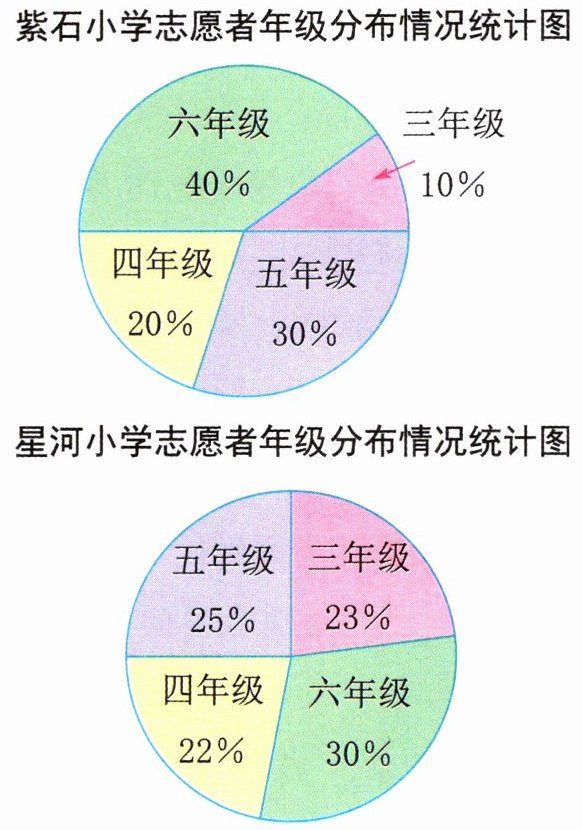 4. 下面是紫石小学和星河小学志愿者年级分布情况统计图。