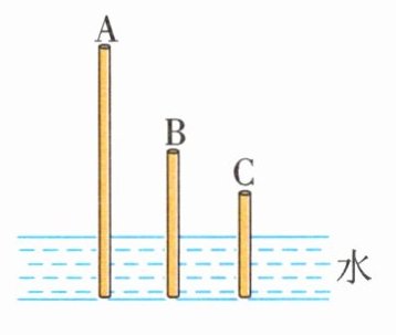 (2) 把A、B、C三根木棒竖直插在水中(如图),三根木棒的长度和是360厘米。A木棒有$\frac{3}{4}$露出水面,B木棒有$\frac{4}{7}$露出水面,C木棒有$\frac{2}{5}$露出水面。水深多少厘米?