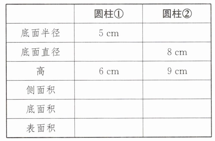 从上往下,从左往右依次填:$10\ cm$ $188.4\ cm^{2}$ $78.5\ cm^{2}$ $345.4\ cm^{2}$ $4\ cm$ $226.08\ cm^{2}$ $50.24\ cm^{2}$ $326.56\ cm^{2}$