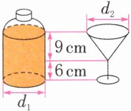 4. 右面是一个装了一些果汁的瓶子和一个圆锥形玻璃杯,已知 $ d_{1} = d_{2} $。如果把瓶子中的果汁全部倒入这个圆锥形玻璃杯,最多可以倒满( )杯。(瓶子和玻璃杯的壁厚忽略不计)