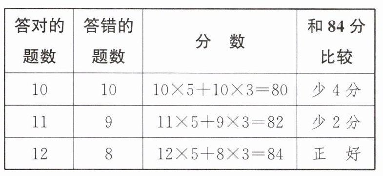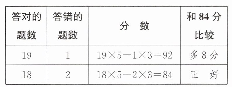 例题2 长江小学举行环保知识竞赛,一共有20题,答对一题得5分,不答不得分,答错一题倒扣3分。赵斌答完所有的题目,结果得了84分。他答对了多少题?