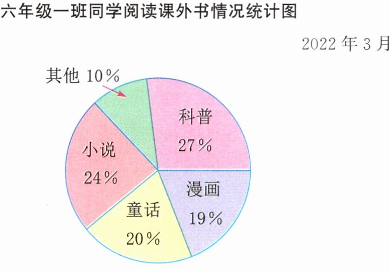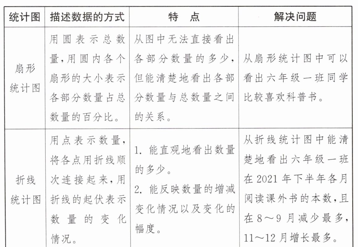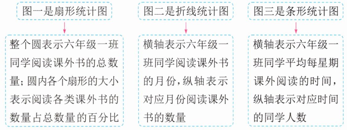 [教材第2页例2] 为了了解六年级一班同学课外阅读的兴趣和习惯,小宇收集了这个班2021年下半年阅读课外书的有关数据,分别制成了下面三幅统计图。