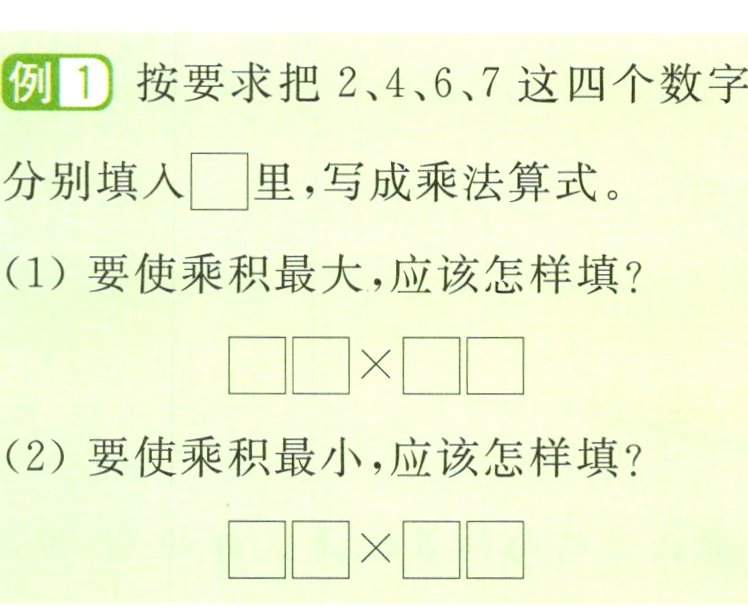 例1 按要求把2、4、6、7这四个数字分别填入$\square$里,写成乘法算式。