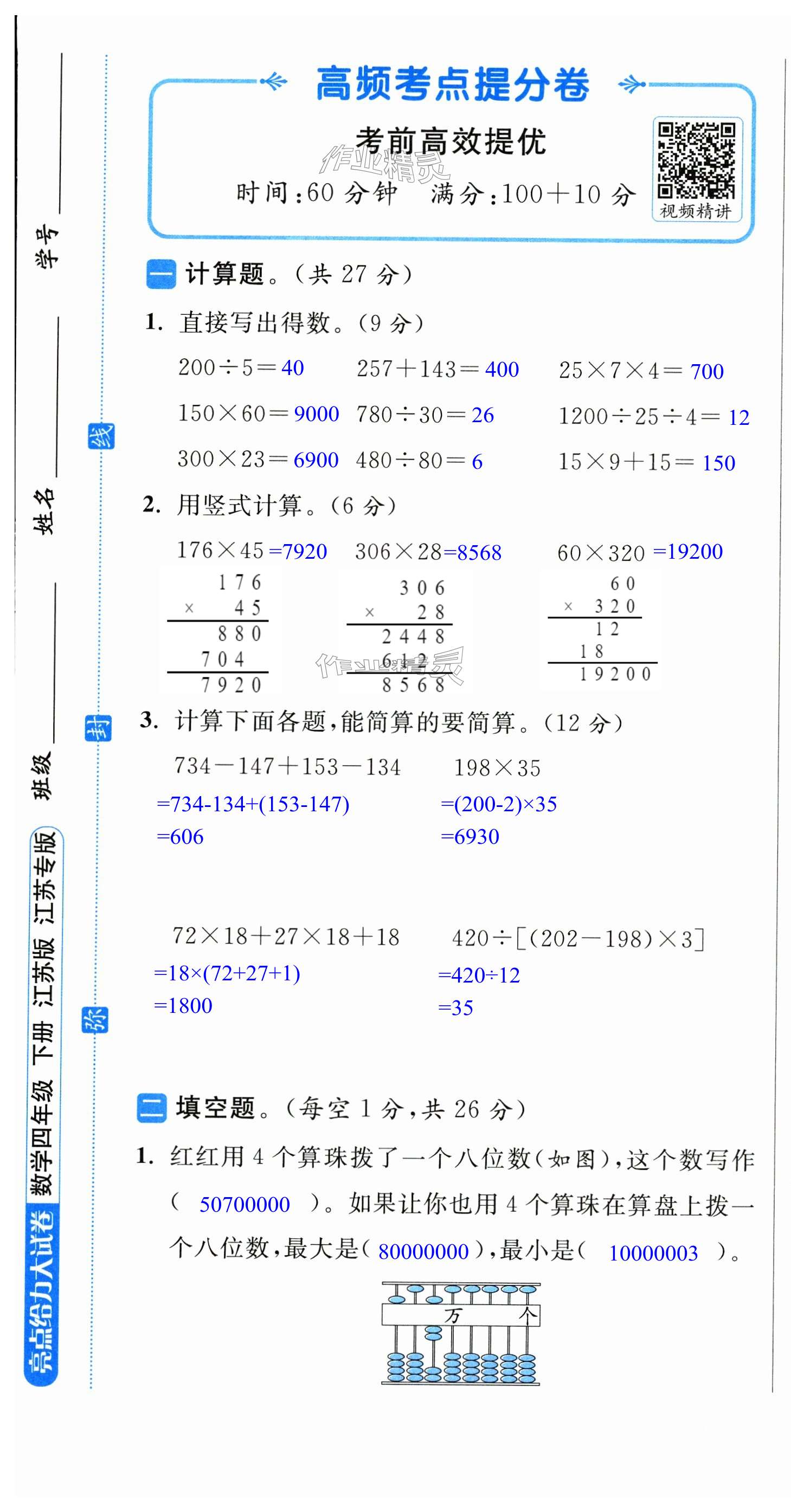 注:目前有些书本章节名称可能整理的还不是很完善,但都是按照顺序排列的,请同学们按照顺序仔细查找。练习册 2025年亮点给力大试卷四年级数学下册苏教版 答案主要是用来给同学们做完题方便对答案用的,请勿直接抄袭。