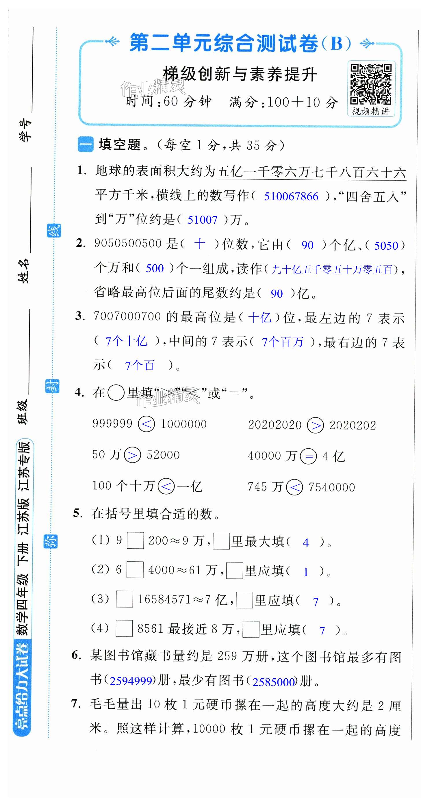 注:目前有些书本章节名称可能整理的还不是很完善,但都是按照顺序排列的,请同学们按照顺序仔细查找。练习册 2025年亮点给力大试卷四年级数学下册苏教版 答案主要是用来给同学们做完题方便对答案用的,请勿直接抄袭。