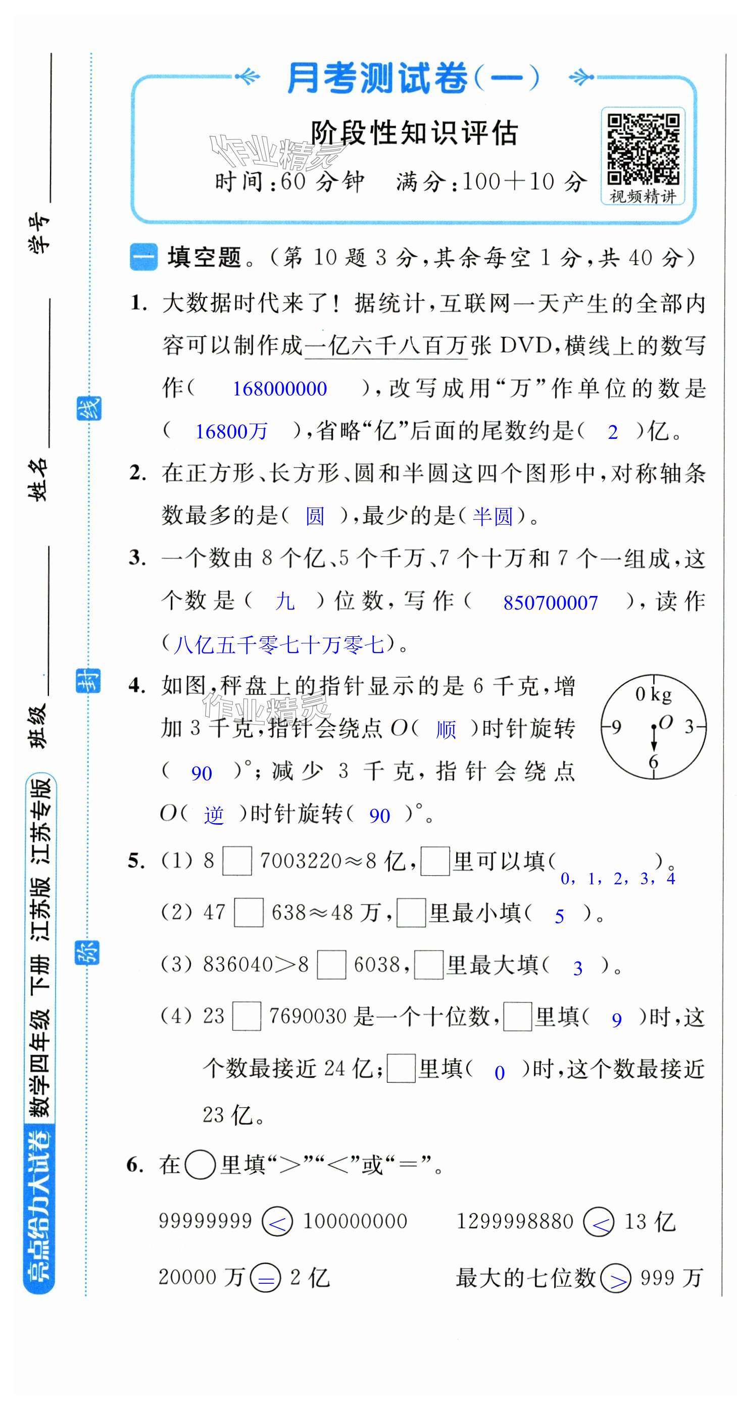 注:目前有些书本章节名称可能整理的还不是很完善,但都是按照顺序排列的,请同学们按照顺序仔细查找。练习册 2025年亮点给力大试卷四年级数学下册苏教版 答案主要是用来给同学们做完题方便对答案用的,请勿直接抄袭。