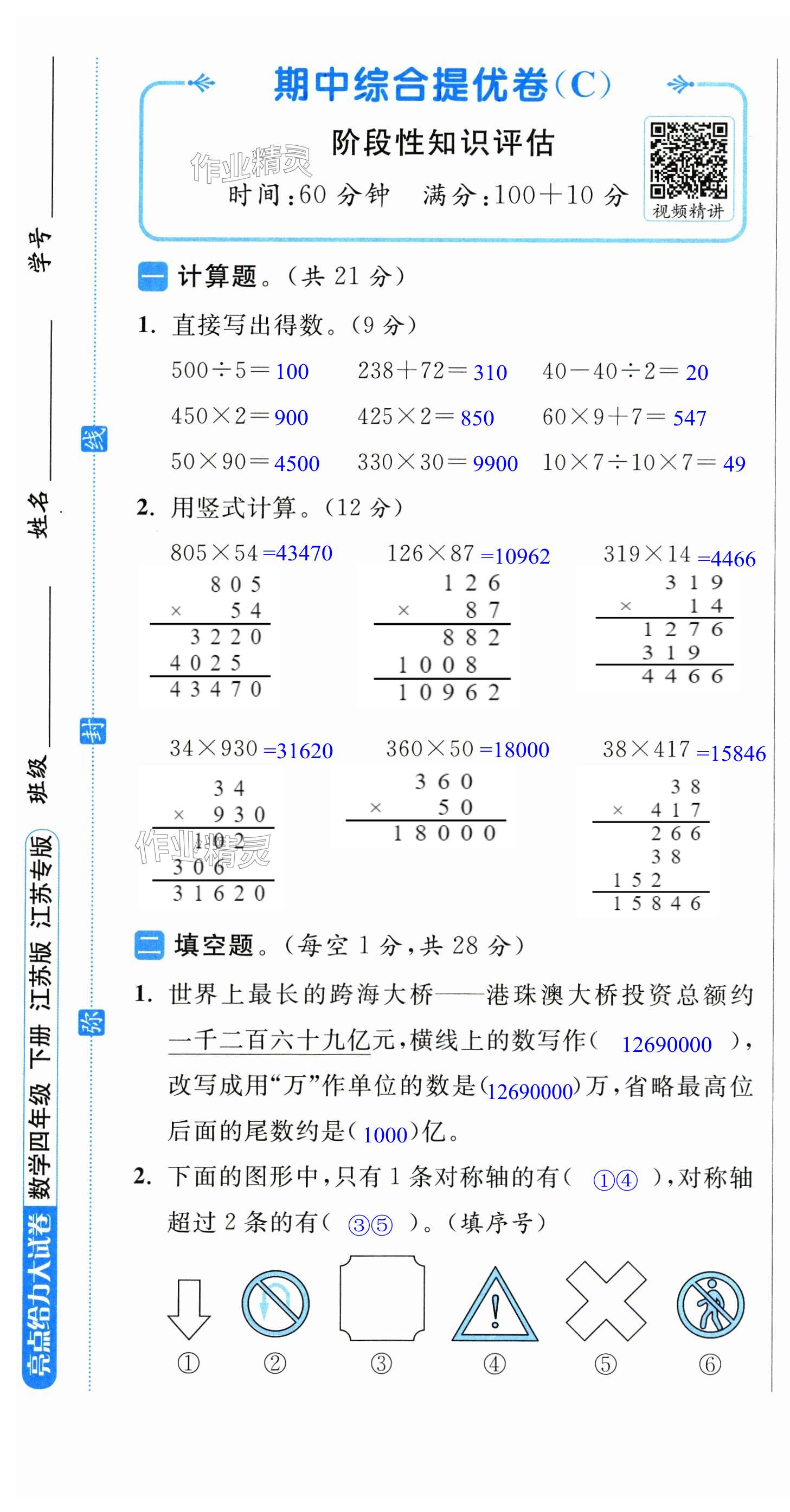 注:目前有些书本章节名称可能整理的还不是很完善,但都是按照顺序排列的,请同学们按照顺序仔细查找。练习册 2025年亮点给力大试卷四年级数学下册苏教版 答案主要是用来给同学们做完题方便对答案用的,请勿直接抄袭。