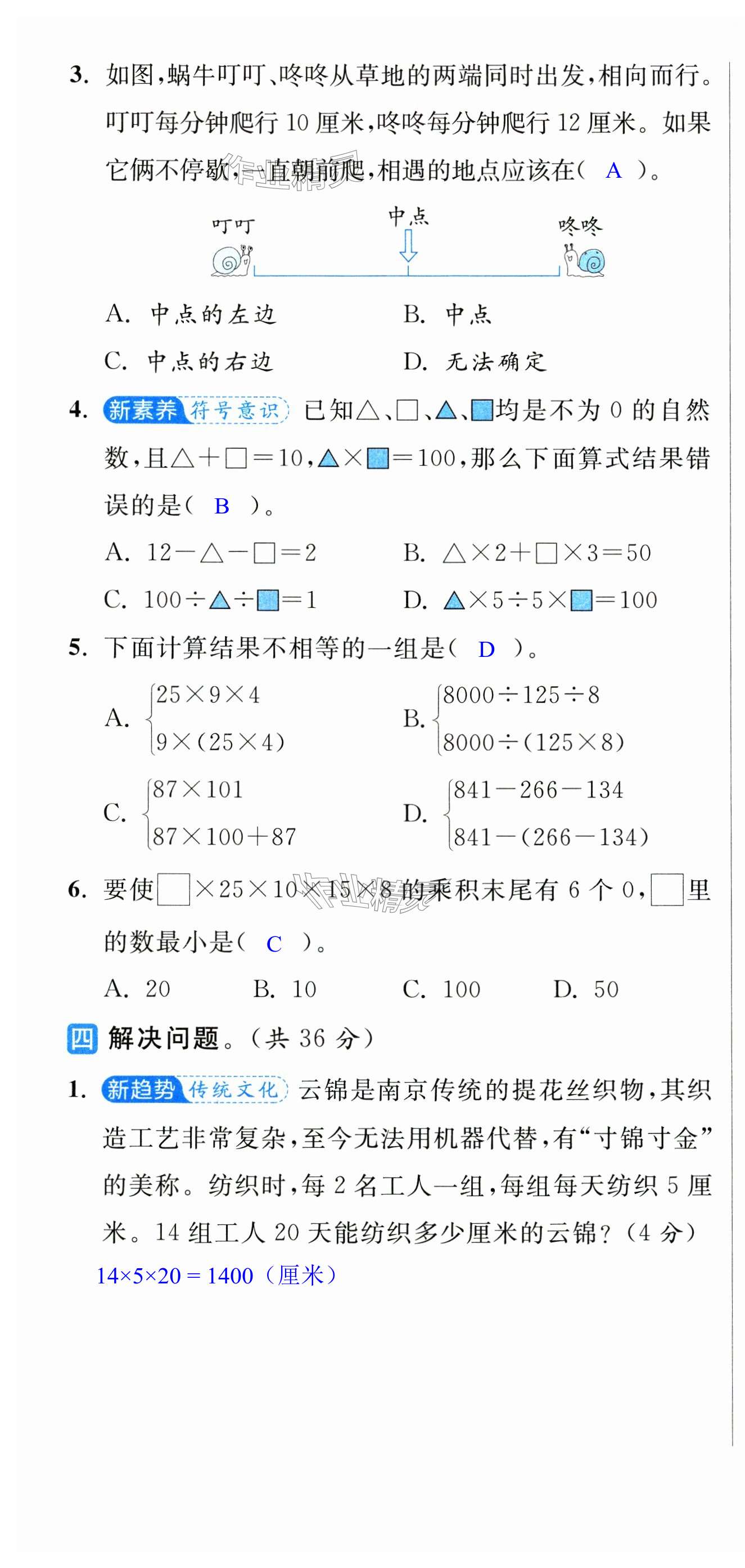 注:目前有些书本章节名称可能整理的还不是很完善,但都是按照顺序排列的,请同学们按照顺序仔细查找。练习册 2025年亮点给力大试卷四年级数学下册苏教版 答案主要是用来给同学们做完题方便对答案用的,请勿直接抄袭。