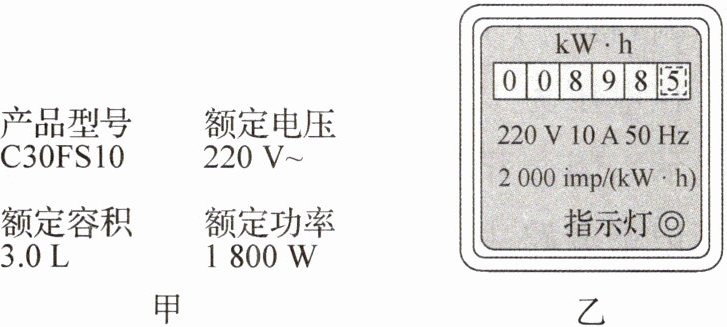9. 亮点原创 2024年,AI应用全面绽放,中国人工智能加速融入人们的生产和生活中,很多年轻人将智能炒菜机器人引进了家庭. 如图甲为某品牌智能炒菜机器人的部分铭牌信息,小亮将该机器人单独接入家庭电路正常炒菜,若5 min后炒菜结束,则此过程消耗的电能为________J;若炒菜过程中如图乙所示的电能表的指示灯闪烁了250次,则该机器人的实际功率为________kW.