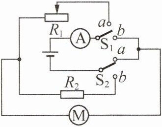 10. 如图是某电动玩具车的工作原理示意图. 已知电源电压恒为6 V,$R_{2}$的阻值为5 Ω,电动机的额定功率为4 W、额定电压为5 V. 开关$S_{1}$和$S_{2}$只能同时接a或同时接b,车前进时能调节电动机的转速,后退时不能调节电动机的转速,则: