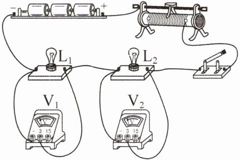 8. 实验室有两个额定电压相同的小灯泡$L_{1}$、$L_{2}$,小华想知道哪个小灯泡额定功率大,于是将它们串联接入电路,如图所示. 闭合开关,两个小灯泡均发光,电压表$V_{1}$示数比$V_{2}$小,此时实际功率较大的小灯泡是________. 据此小华可以判断,额定功率较大的小灯泡是________.(小灯泡电阻不受温度影响)
