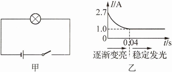11. 新素养 科学探究 (2024·陕西西安模拟)生活中灯泡被烧坏经常发生在开关闭合的一瞬间,某兴趣小组为了找到原因,将一个标有“36 V 25 W”的灯泡接在电压为12 V的恒压电源上(如图甲所示),闭合开关的瞬间($t = 0$)利用传感器记录电路中电流随时间变化的情况(如图乙所示),利用高速摄影技术可以观察到前0.04 s灯丝经历了从不发光、微微发光到逐渐变亮的过程;0.04 s以后灯泡逐渐变为稳定发光. 下列说法正确的是( )