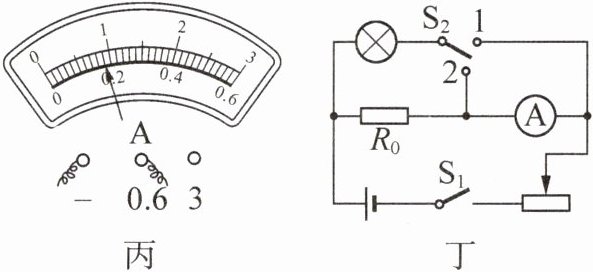(4)完成上面实验后小红同学进行了反思,如果电压表损坏了,能不能用其他实验器材来完成实验呢?经过思考,她选用了一个阻值为10 Ω的定值电阻R₀,设计了如图丁所示的电路,请将实验步骤补充完整.