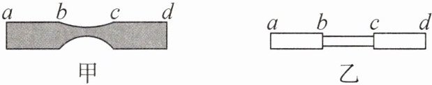 7. 新素养 科学思维(2024·安徽滁州一模)如图甲所示,先将包口香糖的锡纸中间剪掉一些,再将锡纸条接在干电池的正负极上,不一会儿锡纸条开始冒烟并着火. 为了便于从电学角度分析锡纸条bc段着火的原因,小明将图甲所示的锡纸简化为图乙所示的形状,然后比较ab段和bc段的相关电学物理量. 下列四个选项中正确的是