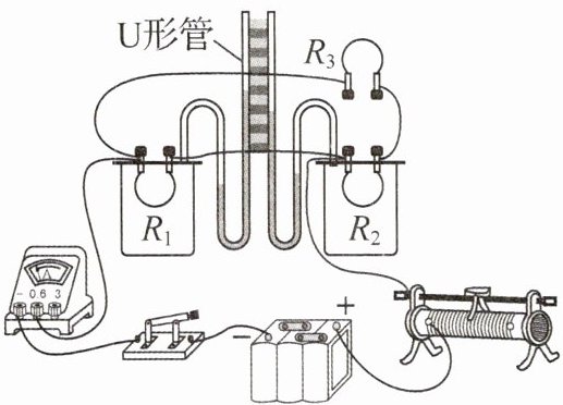 10. 如图所示为学校兴趣小组改进后的探究“电流通过导体产生的热量与电流大小的关系”实验装置. 其中R₁、R₂、R₃是发热电阻丝,R₁、R₂分别安装在两个密封容器瓶中,容器瓶内密封有相同质量的空气,两容器瓶各接一支相同的U形管,U形管另一端开口,两U形管内注入等量的同种液体.