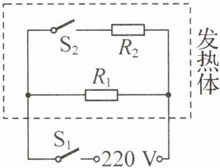 6. 如图所示是某电热器的工作原理图,它有高温、低温两挡,其发热体由R₁和R₂两个电热丝构成,它们的阻值分别为110 Ω、220 Ω. 求:
