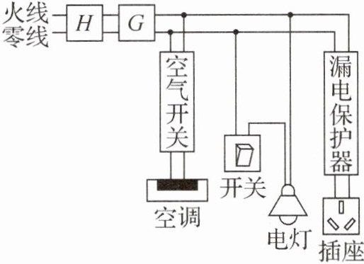 A@@解析:由家庭电路的安装顺序可知,H处为电能表,G处为总开关,故A正确;为了安全用电,电灯开关应连接在火线和电灯之间,故B错误;插座处发生短路,干路中电流会变大,但火线和零线中的电流仍是相等的,不属于漏电情况,所以漏电保护器不会切断电路,故C错误;空气开关的作用是当电路中电流过大时,自动切断电路,但不能预防短路,故D错误。