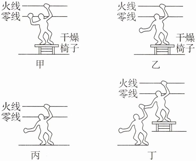乙@@甲@@不会@@解析:人体也是导体,当有一定强度的电流流过人体时,就会发生触电事故。图甲中,人站在干燥的椅子上,一手接触火线,一手接触零线,火线、人体、零线构成通路,有电流流过人体,所以会发生触电事故;图乙中,人站在干燥的椅子上,一手虽然与火线接触,但由于干燥的椅子是绝缘体,火线、人体、大地之间不能构成通路,没有电流流过人体,所以不会发生触电事故;图丙中,人站在地面上,一手接触火线,火线、人体、大地构成通路,有电流流过人体,所以会发生触电事故;图丁中,一人站在干燥的椅子上,一手接触火线,一手与站在地面上的另一人手拉手,此时火线、两人体和大地构成了通路,有电流流过人体,所以会发生触电事故。综上所述,不会发生触电事故的是图乙。家庭电路中,若某用电器漏电,或人因操作失误而触电,有电流经人体流向大地,漏电保护器会自动切断电路,即跳闸,可知发生触电事故时漏电保护器不会跳闸的是图甲;空气开关只有在电路中电流超过额定电流时才会自动断开,即跳闸,所以发生触电事故时,电路中的空气开关不会跳闸。