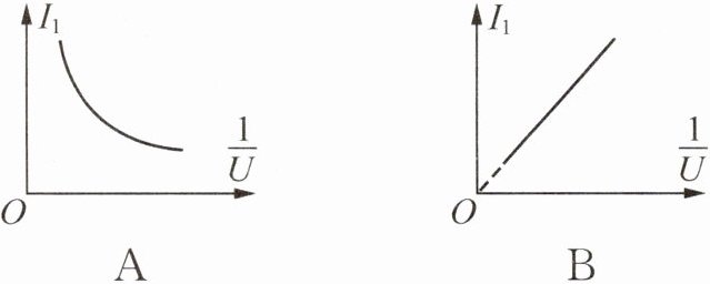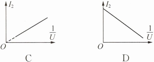 8. (2024·江苏南通二模)如图电路中,电源为恒功率电源,工作时输出的总功率大小恒定,$R_1$ 为定值电阻. 移动滑动变阻器 $R_2$ 的滑片 P,下列表示通过 $R_1$ 的电流 $I_1$、通过 $R_2$ 的电流 $I_2$ 随电压表示数的倒数 $\frac{1}{U}$ 的变化关系图线中,可能正确的是 ( )