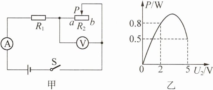6. 如图甲电路中,$R_1$ 为定值电阻,$R_2$ 为滑动变阻器. 闭合开关 S,滑动变阻器的滑片从 $a$ 端滑动到 $b$ 端的过程中,$R_2$ 消耗的功率 $P$ 与电压表示数 $U_2$ 的关系图像如图乙所示. 则 $R_2$ 的最大阻值为________Ω,$R_1$ 的阻值为________Ω,该电路消耗的最大功率为________W.