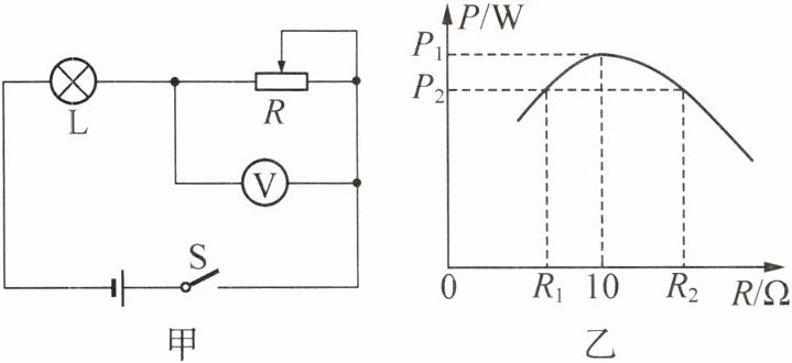 (3)如图乙所示,当滑动变阻器接入电路的阻值分别为 $R_1$、$R_2$ 时,滑动变阻器的功率均为 $P_2$. 则在电路安全范围以内,$R_2$ 的最大阻值为多少?