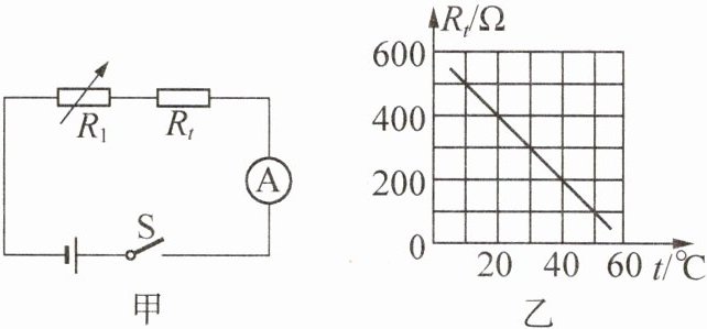 3. 图甲为某电子测温仪的内部简化电路图,测温仪探头内有一热敏电阻$R_{t}$,其阻值随温度变化的关系图像如图乙. $R_{1}$为阻值可调的电阻箱,其最大电阻为200 Ω,允许通过的最大电流为0.3 A;电流表量程为0~0.02 A,电源电压恒为6 V. 某次测试时,将电阻箱阻值调到200 Ω,电流表示数为0.01 A. 下列说法错误的是 ( )