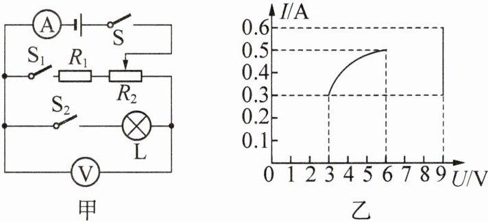 5. 如图甲所示电路,电流表量程为0~0.6 A,电压表量程为0~15 V,在保证所有元件安全的情况下,第一次只闭合开关S和$S_{1}$,将滑动变阻器的滑片由最右端向左最大范围移动;第二次只闭合开关S和$S_{2}$,将滑片由最左端向右移动到某处时灯泡恰好正常发光. 两次滑片移动过程中电压表与电流表的示数关系图像如图乙.