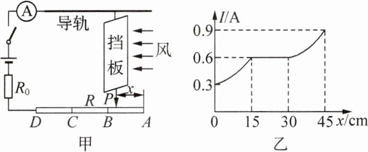 2. 某控制电路的简化电路图如图甲,电源电压恒为9V,R₀是定值电阻,R由三段材料不同、横截面积相同且长度均为15cm的均匀导体AB、BC、CD制作而成,其中一段是铜丝,另两段是电阻丝(阻值与自身长度成正比),和R接触良好并能移动的滑片P与挡板连接,挡板可在导轨上左右滑动,铜丝、挡板和导轨的电阻均为零. 闭合开关,挡板从右向左移动过程中,电流表示数随x(AP长度)的变化关系如图乙所示,则电阻R₀为________Ω;滑片P滑动过程中,R的电功率从最大值变到1.8W,x的最大变化量为________cm.