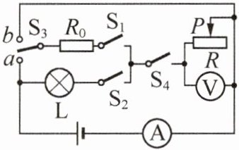 1. 如图电路中,电源电压不变,定值电阻的阻值为R₀,灯丝电阻为Rₗ,忽略温度对灯丝电阻的影响,R₀∶Rₗ = 1∶2. 先将单刀双掷开关S₃拨至触点a,只闭合开关S₁、S₄,滑片P位于最右端时,电压表示数为6V,电流表示数为I₁,电路的总功率为P₁;只闭合开关S₂、S₄,滑片P移至中点时,电压表示数为2V,电流表示数为I₂,电路的总功率为P₂. 再将单刀双掷开关S₃拨至触点b,只闭合开关S₁、S₂时,电流表示数为0.3A. 下列说法正确的是 ( )