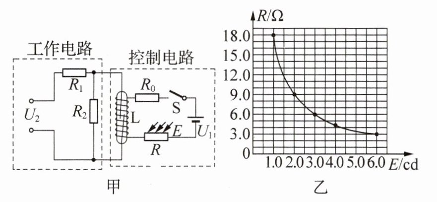 3. 自动控制电路在人工智能的发展领域中发挥着至关重要的作用,如图甲所示是由控制电路和工作电路组成的光控电路. 控制电路由光敏电阻R、磁控开关L、定值电阻R₀、电源U₁等组成,当线圈中的电流大于或等于15mA时,磁控开关L的磁性弹片相互吸合. 工作电路由工作电源U₂和发热电阻R₁、R₂组成. 已知:U₂ = 30V,R₁ = 10Ω,R₂ = 20Ω,光敏电阻R的阻值随照射在光敏电阻上的光强E(表示光照射强弱的物理量,单位是坎德拉,符号是cd)变化的关系如图乙所示,则: