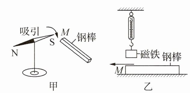 (2)如图乙所示,挂在弹簧测力计下的磁铁下端为N极. 水平向左移动钢棒的过程中,弹簧测力计示数持续变大. 小明由此判断,钢棒原来一定具有磁性,且M端是________(选填“N”或“S”)极. 本实验若把磁铁换成软铁块,会出现的情况是________________________.