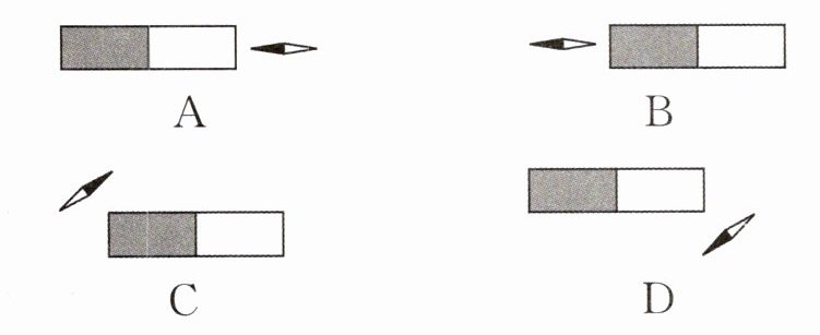 3. (2024·广东广州二模)以下图示四个选项里的条形磁体中有三个是N极被涂灰,一个是S极被涂灰. 放在条形磁体周围的小磁针(小磁针N极被涂黑)静止时情况如选项中所示,则条形磁体S极被涂灰的是 ( )