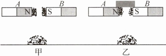 10. 如图甲所示,桌面上放有一定量的铁屑,现将两根完全相同的条形磁体A和B放置在靠近铁屑的上方并吸附一定量的铁屑. 如图乙所示,将一根长度略大于两磁体间距的软铁棒轻轻放置在两磁体上,软铁棒由于被________,相当于与A、B形成一个磁体,则被吸附的铁屑会________(选填“增加”“不变”或“减少”).