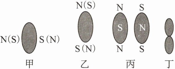 3@@每块磁体只有两个磁极@@2@@方法一:使椭球形磁铁短轴方向上下放置,拿住上面的磁铁,观察下面的磁铁是否会掉落。方法二:将椭球形磁铁按图丁所示方法放在水平桌面上拉动。@@铁屑(大头针)@@用椭球形磁铁去吸引铁屑(大头针)@@吸引铁屑(大头针)最多的位置就是椭球形磁铁的磁极
