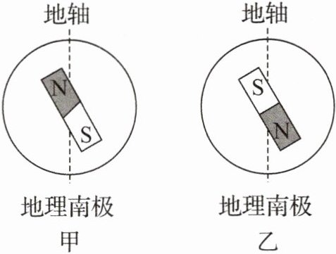 4. 新趋势 情境素材 “澳门科学二号”卫星计划于2026年底或2027年初发射,届时将与“澳门科学一号”卫星组成星座,形成全球第一个高精度地球磁场立体观测系统.若假想地磁场是由地球内部一块大磁体产生的,如图所示,请你猜测能合理描述这块大磁体的是图________(选填“甲”或“乙”),你的解释是____________________.