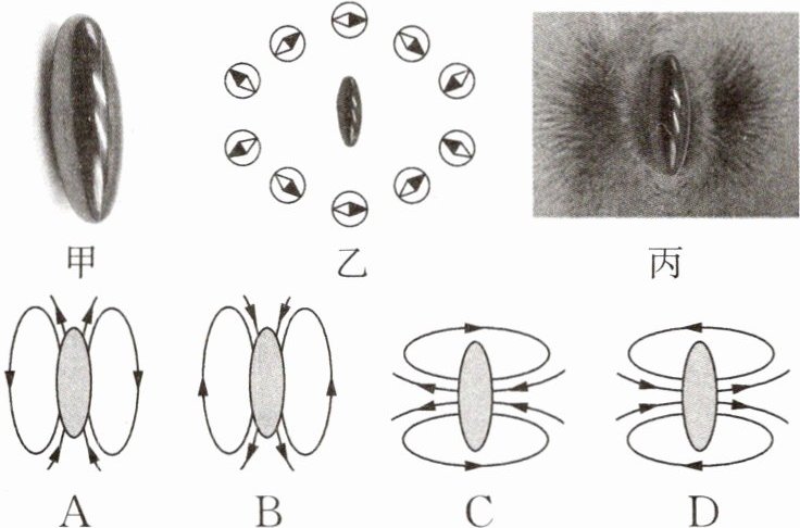 8. 小冬学习磁学知识后,想研究橄榄形磁体(如图甲)周围的磁场分布情况,做了如图所示的实验,其中图乙是小磁针(黑色为N极)静止时的指向,图丙是铁屑静止时的分布.下列选项中磁感线能正确描述以上实验现象的是( )