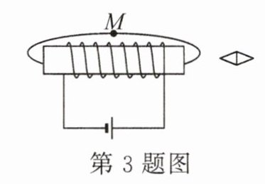 3. 如图所示,通电螺线管周围存在磁场,M是某条磁感线上的一点,小磁针静止在磁场中,则M点的磁场方向及小磁针左端的极性分别是 ( )